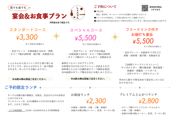 3,300円(税込)/お一人様 ※前日までにご予約ください。2名様からご予約可。